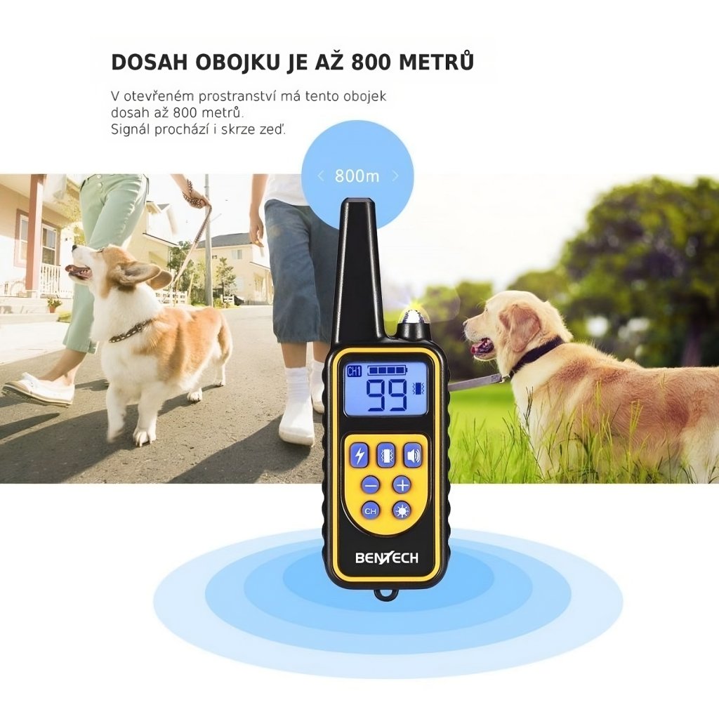 Dosah tohto obojku je až 800 metrov. Vysielač je nabíjateľný a pre každú funkciu má svoje tlačidlo. Prijímač disponuje gumovými elektródami, ktroré sú šetrné ku koži psa. Navyše môžete na prijímači diaľkovo zapnúť LED osvetlenie, vďaka ktorému je možné lokalizovať vášho psa aj v tme. Vysielačka a aj prijímač sú vybavené dobíjacími batériami. Výhodou je aj vstavaná Li-Pol batéria s rýchlym nabíjaním a dlhšou výdržou.
