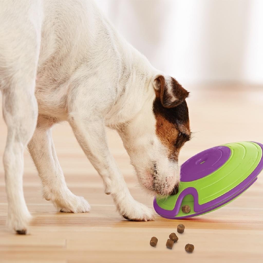 Hračka je veľmi jednoduchá a extrémne zábavná. Pomocou dvoch otvorov vložte pamlsky a zvyšok nechajte na vašom chlpáčovi! Počas hry sa bude disk náhodne otáčať a preklápať. Vďaka tomu sa budú pamlsky pohybovať vo vnútri labyrintu a postupne vypadávať, takže psík rozhodne nestratí o hračku záujem.