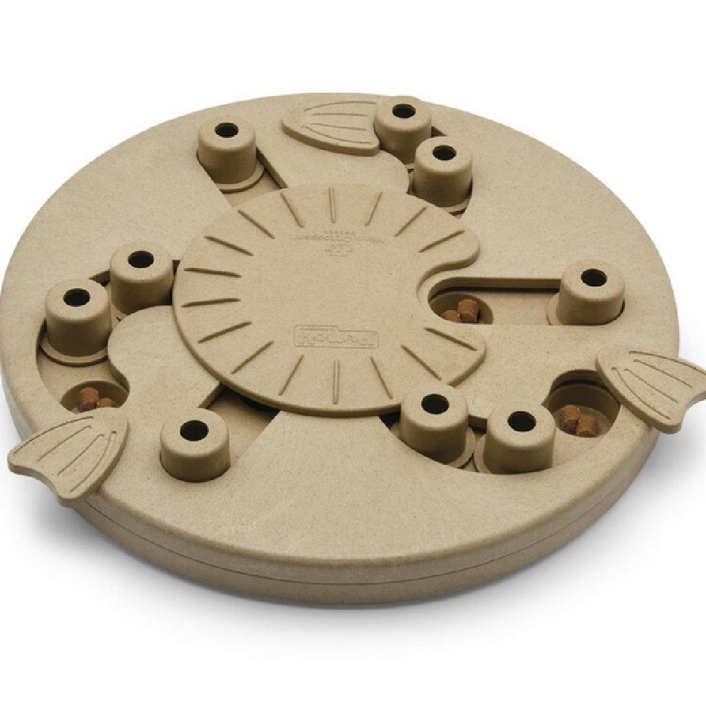 Zatoč, potlač labkou a mlsaj! Otočné plutvičky na krajoch hlavolamu zakrývajú prvé priehradky, posuvné časti hlavolamu prekrývajú ďalšie. Posunutím posuvných častí môže váš psík, alebo mačka odblokovať otočný stredový kruh a odhaliť tak ďalšie priehradky, ktoré skrýva. Vďaka viacerým samostatným spôsobom pohybu je možné nastaviť obtiažnosť hlavolamu tak, aby zodpovedala aktuálnym schopnostiam vášho maznáčika.