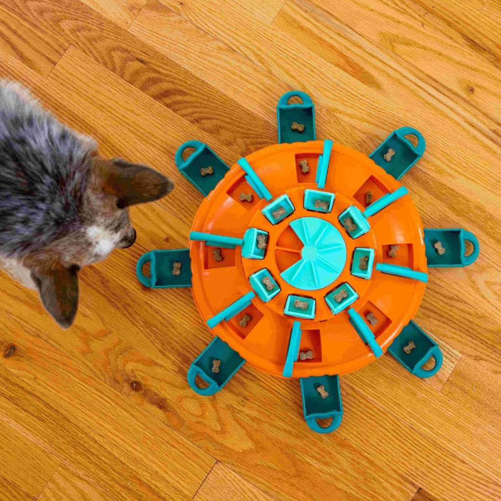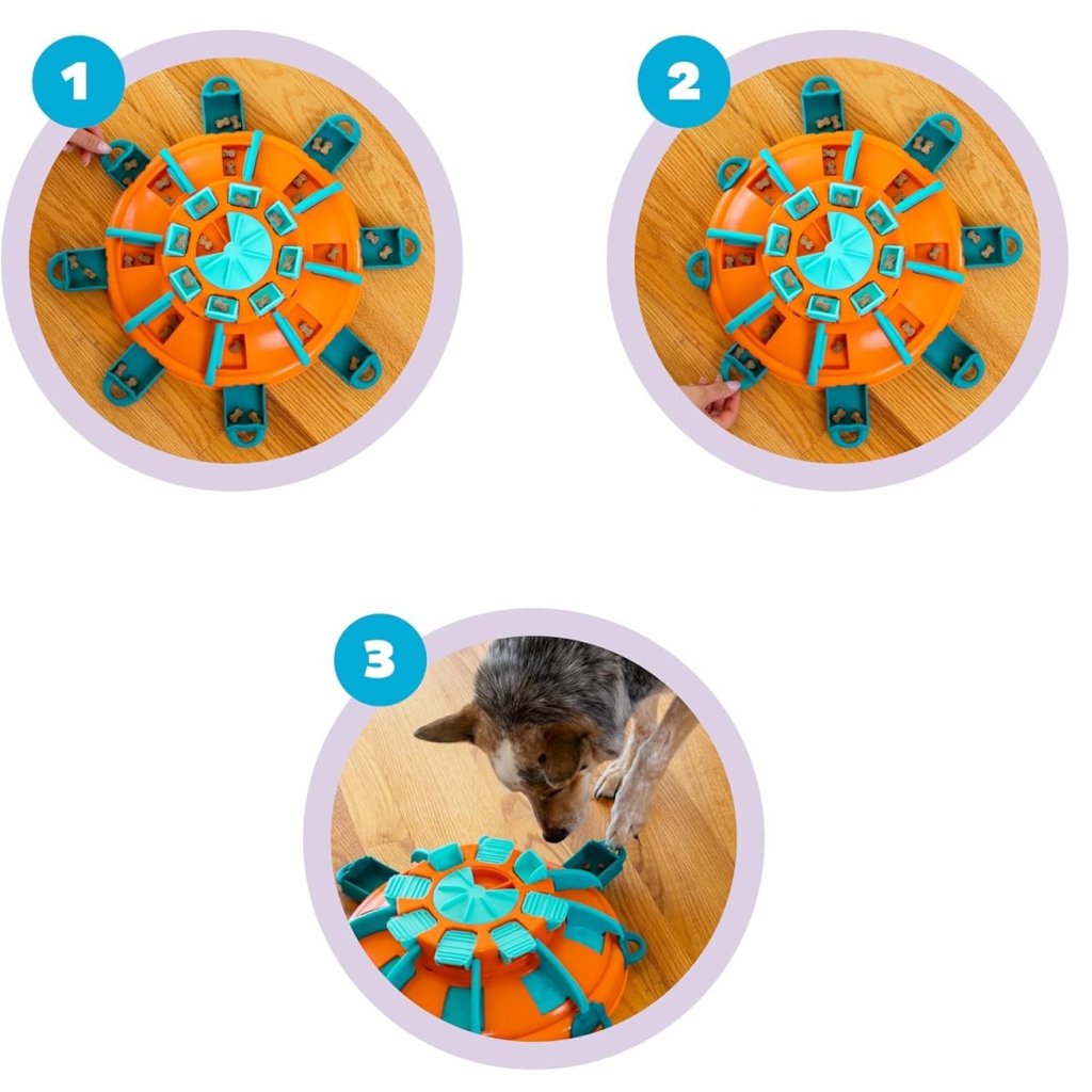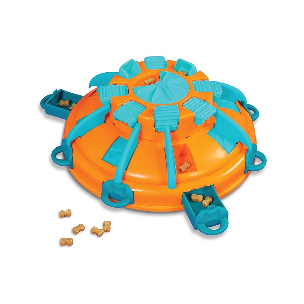 Hra začína zhora – pes musí vrstvu po vrstve odomykať, otáčať, posúvať a preklápať prvky v správnom poradí, aby sa dostal k maškrtám. Táto interaktívna výzva stimuluje myseľ, udrží pozornosť a poskytne psovi zábavu na dlhé minúty. Ideálne pre skúsených riešiteľov a psy všetkých veľkostí.