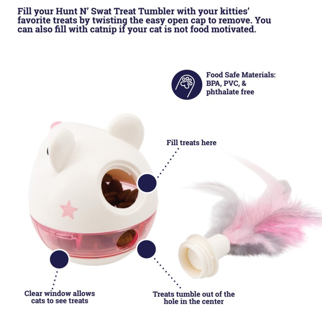 Zamestnajte zvedavé mačky s interaktívnou plniacou hračkou pre mačky Hunt 'N Swat. Hunt 'N Swat sa pri dotyku nepredvídateľne kolíše a kotúľa.