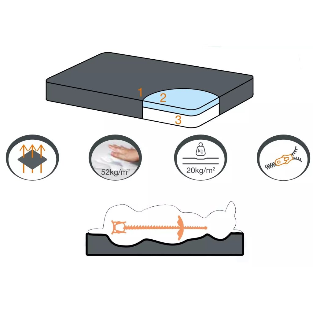 - Elasticita peny zmierňuje tlak na kĺby, zaisťuje prirodzenú polohu chrbtice a prispôsobuje sa tvaru tela. Takto je hmotnosť zvieraťa rovnomerne rozprestretá na maximálny povrch matraca.